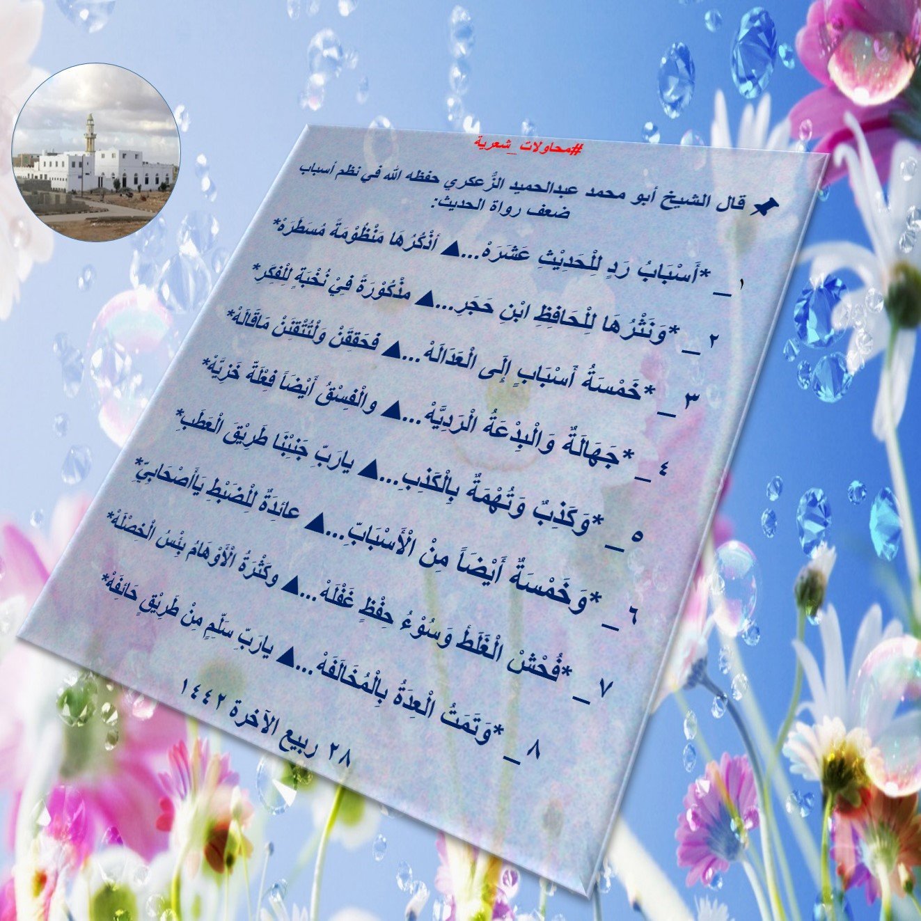 الأحد 28 ربيع الثاني 1442 هــــ | محاولات شعرية | شارك بتعليقك #محاولات_شعرية أبيات شعرية لتقريب أسباب ضعف الرواة في الحديث #محاولات_شعرية ▪️للشيخ الوالد أبي محمد عبدالحميد الحجوري الزعكري حفظه الله 📢 مسجد الصحابة بالغيضة, المهرة، اليمن حرسها الله. 🗓 الاحد 28/ ربيع الآخر / 1442 هجرية. ♻️أبيات شعرية لتقريب أسباب ضعف الرواة في الحديث♻️ ⌚️المدة الزمنية: 01:26 مشاركة Share on X (فتح في نافذة جديدة) X Share on Telegram (فتح في نافذة جديدة) Telegram Share on WhatsApp (فتح في نافذة جديدة) WhatsApp Share on Facebook (فتح في نافذة جديدة) فيس بوك اطبع (فتح في نافذة جديدة) طباعة قال الشيخ أبو محمد عبدالحميد الزُّعكري حفظه الله في نظم أسباب ضعف رواة الحديث: قال أبو محمد عبدالحميد الزُّعكري حفظه الله في نظم باب من يعتبر وما لا يعتبر في الشواهد والمتابعات: مقالات ذات صلة يَمَِنيٌّ وَالْحَمْدُ لِلهِ دَوْمًا… إِذْ حَبَانِي بِسُنَّةٍ وَهِدَايَة #محاولات_شعرية ١_ يَمَِنيٌّ وَالْحَمْدُ لِلهِ دَوْمًا… إِذْ حَبَانِي بِسُنَّةٍ وَهِدَايَة ٢_ يَمَِنيٌّ أَثْنَى... يَمَِنيٌّ وَالْحَمْدُ لِلهِ دَوْمًا… إِذْ حَبَانِي بِسُنَّةٍ وَهِدَايَة اقرأ المزيد ١_ قديرٌ أنت يا ربي قديرُ… عليمٌ خالقٌ برٌ كبيرُ #محاولات_شعرية ١_ قديرٌ أنت يا ربي قديرُ… عليمٌ خالقٌ برٌ كبيرُ ٢_ كريمٌ رازقٌ تعطي البرايا… إلهي يا إلهي... ١_ قديرٌ أنت يا ربي قديرُ… عليمٌ خالقٌ برٌ كبيرُ اقرأ المزيد أقدار ربي تمضي… رباه أنت حسبي #محاولات_شعرية ١_ أقدار ربي تمضي… رباه أنت حسبي ٢_ فرج عن العباد… من كل شرٍ عادي ٣_ ظلمٌ وقتلٌ... أقدار ربي تمضي… رباه أنت حسبي اقرأ المزيد